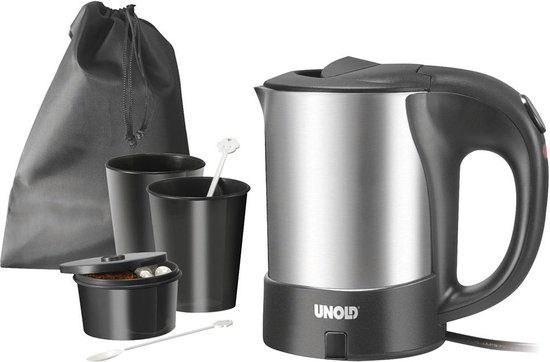 Krachtige roestvrij staal reis-ketel door Unold Klein handig en praktisch thuis of op de weg. Verdere kenmerken: – 1.000 wattage 05 l capaciteit- Verborgen verwarmingselement beschermt tegen corrosie 120/130 Volt / switchable- Automatische uitschakeling Omvang van de levering: – waterkoker- 2 CUPS 2 spoons- Box voor ingrediënten- Bag